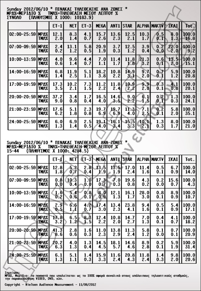 Στην πρώτη θέση της τηλεθέασης ο ΑΝΤ1 με 13,8%. Ακολούθησαν STAR με 11,3% και ΑΝΤ1 με 11%.