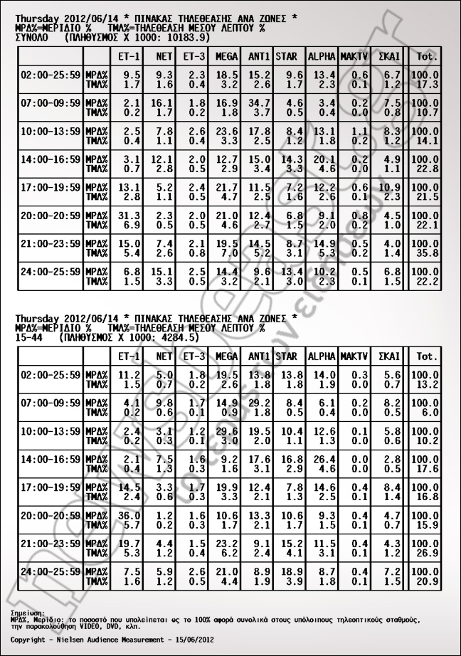Νικητής το δελτίο του ANT1 με 13,3%. Ακολούθησαν και ισοψήφισαν Mega και STAR με 10,6%.