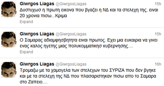 Μέσω twitter σχολίασε ο Γιώργος Λιάγκας το αποτέλεσμα των χτεσινών εκλογών. «Τρομάζω με τα χαμόγελα των στελεχών του ΣΥΡΙΖΑ που δεν βγήκε και με τα στελέχη της ΝΔ που πλασαρίστηκαν πίσω από το Σαμαρά» έγραψε αρχικά.