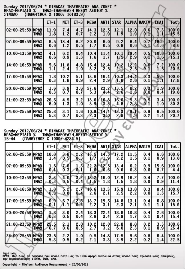 Το δελτίο του ΑΝΤ1 προτίμησαν οι τηλεθεατές, το οποίο συγκέντρωσε ποσοστό τηλεθέασης 22,4%. Ακολούθησε το δελτίο του STAR με 18,8% και το Mega με 18,3%.