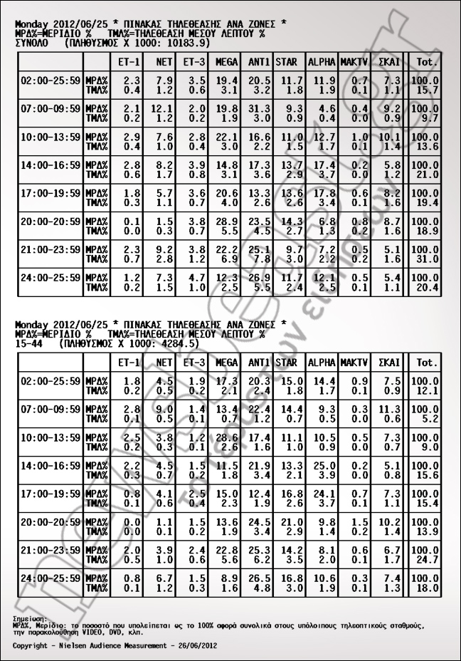 Οι τηλεθεατές προτίμησαν το δελτίο του Mega με 25%. Ακολούθησαν το STAR με 20,4% και ο ΑΝΤ1 με 18%.