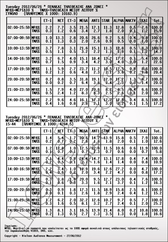 Νικητής στην «κούρσα» της τηλεθέασης το Mega με 31,8%. Ακολούθησαν ΑΝΤ1 με 19,1% και STAR με 12%.
