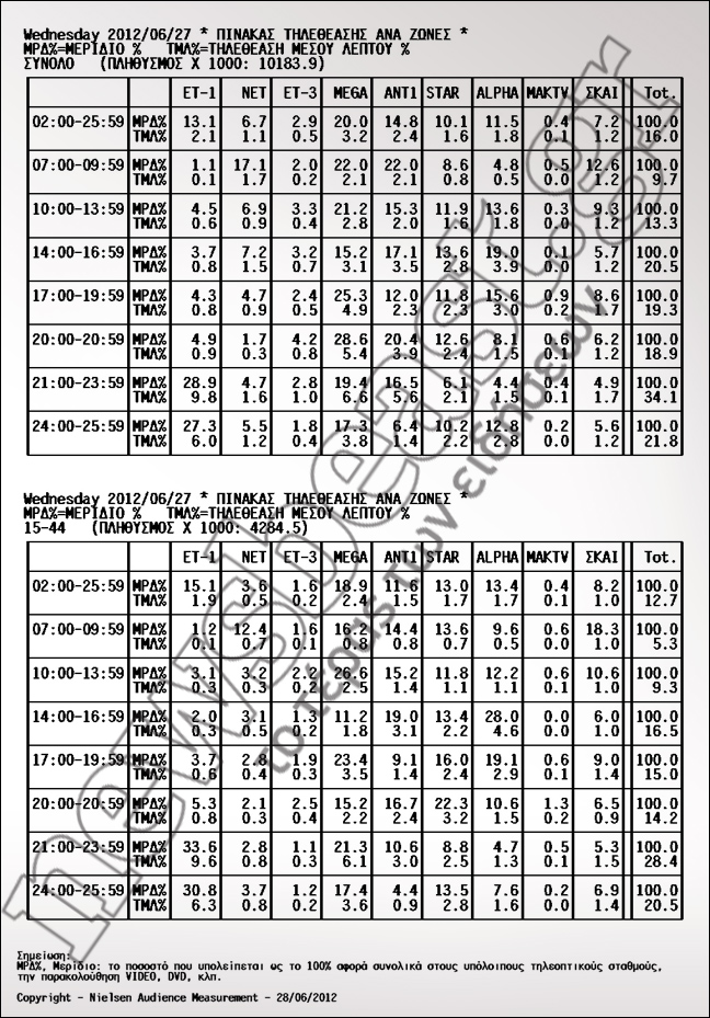 Πρωτιά Mega με 28,6%. Ακολούθησαν ΑΝΤ1 με 20,4% και STAR με 12,6%.
