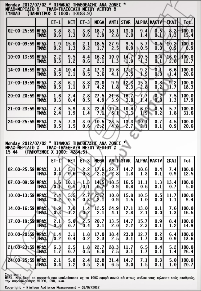Με 27,5% κέρδισε την πρωτιά το δελτίο του Mega. Στη δεύτερη θέση ο ΑΝΤ1 με 21,6% και στην τρίτη το STAR με 16,7%.