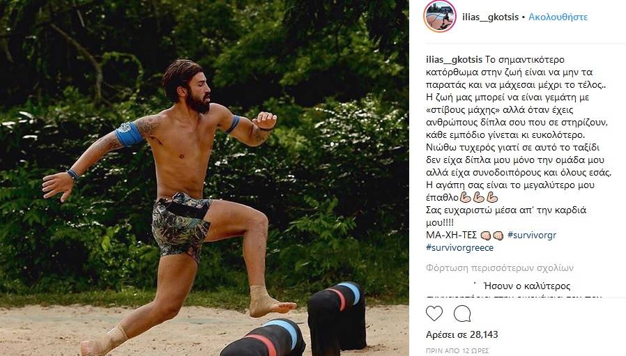 Ο Ηλίας Γκότσης κέρδισε το μεγάλο έπαθλο στο Survivor 2 και με μία ανάρτησή του στον λογαριασμό του στο Instagram θέλησε να ευχαριστήσει τον κόσμο γι την στήριξή του. Ο personal trainer του δεύτερου κύκλου του ριάλιτι επιβίωσης που κέρδισε στον τελικό την Κατερίνα Δαλάκα, έγραψε χαρακτηριστικά: «Το σημαντικότερο κατόρθωμα στην ζωή είναι να μην τα παρατάς και να μάχεσαι μέχρι το τέλος… Η ζωή μας μπορεί να είναι γεμάτη με «στίβους μάχης» αλλά όταν έχεις ανθρώπους δίπλα σου που σε στηρίζουν, κάθε εμπόδιο γίνεται κι ευκολότερο. Νιώθω τυχερός γιατί σε αυτό το ταξίδι δεν είχα δίπλα μου μόνο την ομάδα μου αλλά είχα συνοδοιπόρους και όλους εσάς. Η αγάπη σας είναι το μεγαλύτερο μου έπαθλο Σας ευχαριστώ μέσα απ’ την καρδιά μου!!!! ΜΑ-ΧΗ-ΤΕΣ!».