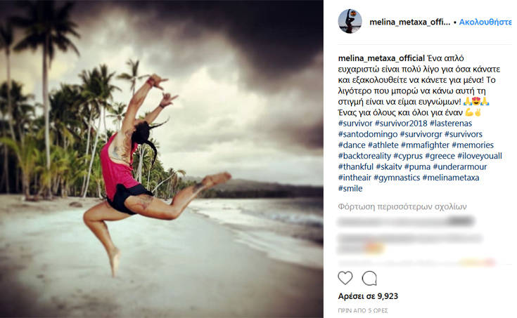 Με μια νέα ανάρτηση στον προσωπικό της λογαριασμό στο Instagram, η Μελίνα Μεταξά ευχαριστεί ξανά όλους όσοι τη στήριξαν μέσα στο Survivor 2 και την στηρίζουν ακόμα. «Ένα απλό ευχαριστώ είναι πολύ λίγο για όσα κάνατε και εξακολουθείτε να κάνετε για μένα! Το λιγότερο που μπορώ να κάνω αυτή τη στιγμή είναι να είμαι ευγνώμων! Ένας για όλους και όλοι για έναν», έγραψε η Μελίνα Μεταξά.