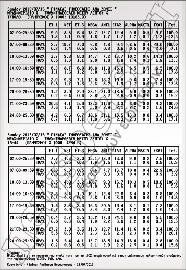 Νικητής στην «κούρσα» της τηλεθέασης το STAR με 24,1%. Στη δεύτερη θέση ο ΑΝΤ1 με 17,8% και στην τρίτη το Mega με 15,2%.