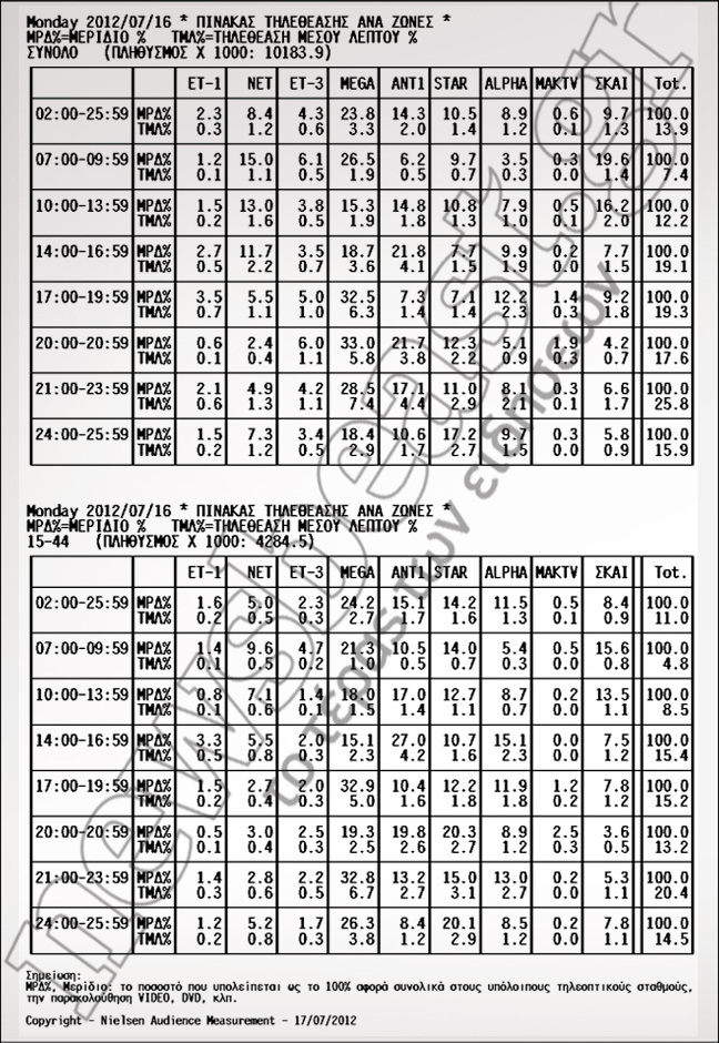 Πρωτιά για το δελτίο του ΑΝΤ1 21,7%. Ακολούθησαν STAR με 12,3% και Mega με 10%.