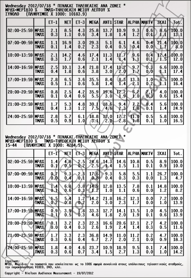 Πρωτιά για το δελτίο του Mega με 35,9%. Ακολούθησαν ANT1 με 19,6% και STAR με 12,2%.