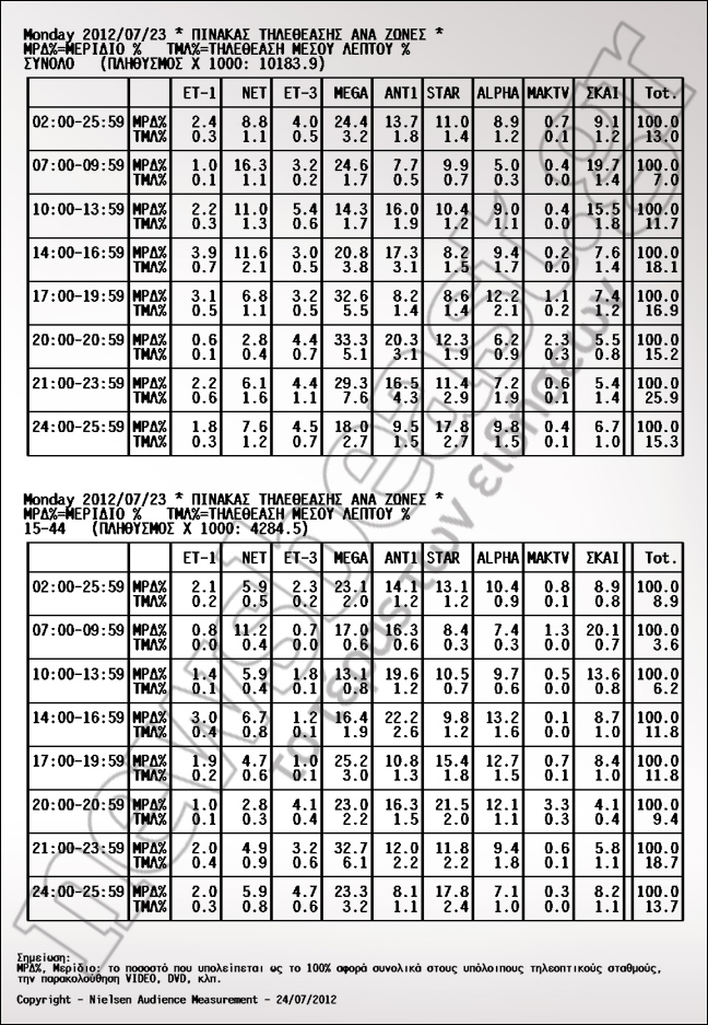 Το δελτίο του Mega προτίμησαν οι τηλεθεατές, το οποίο συγκέντρωσε ποσοστό τηλεθέασης 33,3%. Στη δεύτερη θέση ο ΑΝΤ1 με 20,3% και στην τρίτη το STAR με 12,3%.