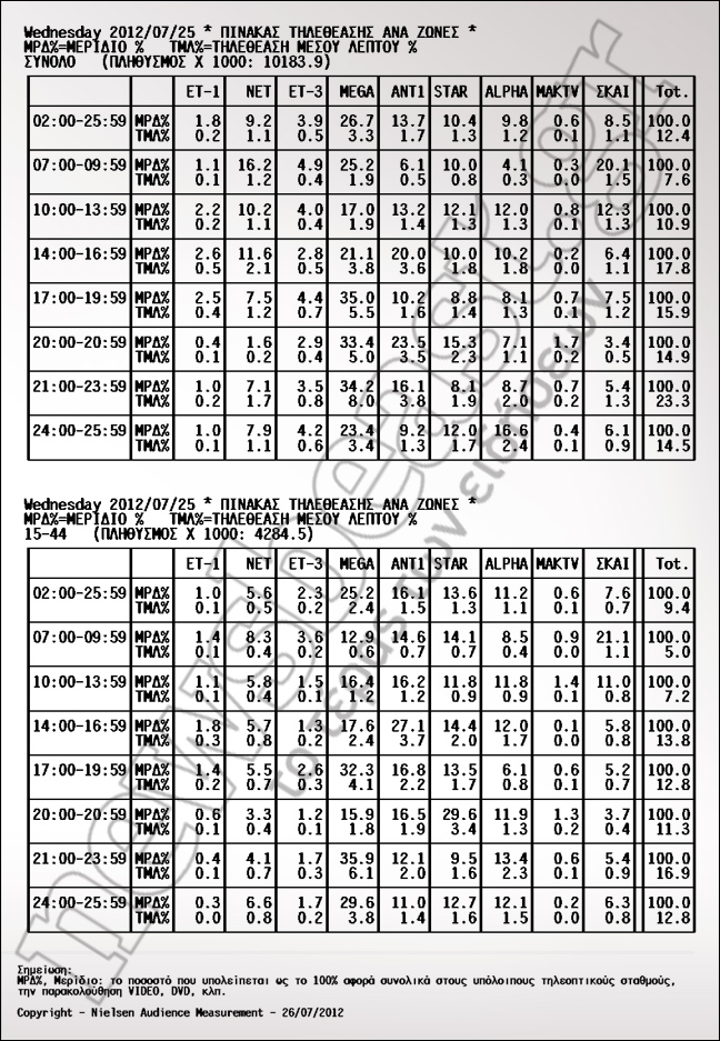 Το δελτίο του Mega προτίμησαν οι τηλεθεατές, το οποίο συγκέντρωσε ποσοστό τηλεθέασης 33,4%. Στη δεύτερη θέση ο ΑΝΤ1 με 23,5% και στην τρίτη το STAR με 15,3%.