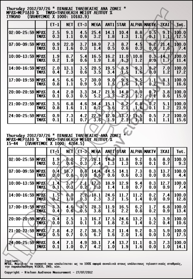 Στην πρώτη θέση της προτίμησης των τηλεθεατών ήρθε το δελτίο του STAR με 24,6%. Ακολούθησαν ΑΝΤ1 με 17,5% και Mega με 16,7%.