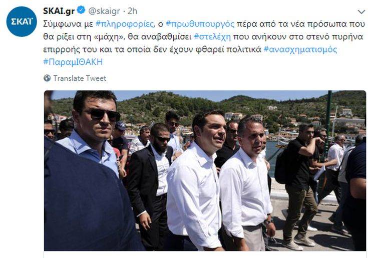 «Η συνοδεία της ανάρτησης στο twitter του τηλεοπτικού σταθμού ΣΚΑΙ περί πληροφοριών για ανασχηματισμό, με το hashtag «παραμΙθάκη», δικαιώνει, για άλλη μια φορά, την απόφαση του ΣΥΡΙΖΑ να απέχει από τις εκπομπές του. Δεν είναι ενημερωτικό κανάλι, αλλά βραχίονας της Ν.Δ. και των πληρωμένων τρολ της», σχολιάζει ο ΣΥΡΙΖΑ.
