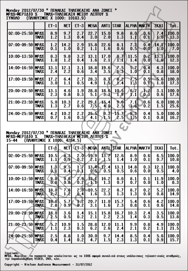 Την πρώτη θέση της προτίμησης των τηλεθεατών κατέκτησε το δελτίο του Star με 16,7%. Ακολουθεί ο ΑΝΤ1 με 15,8% και το Mega με 15,1%