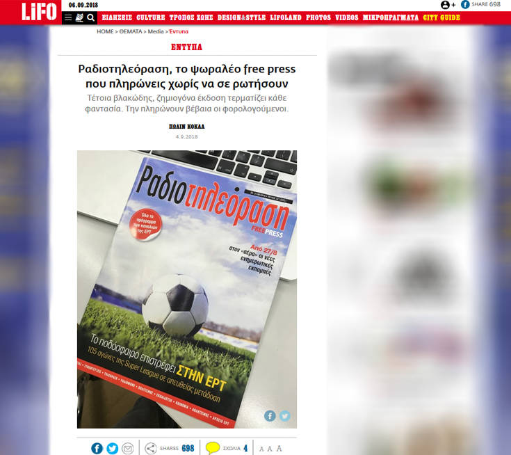 Την αντίδραση της ΕΡΤ προκάλεσε ένα δημοσίευμα της Life για το περιοδικό «Ραδιοτηλεόραση», με τίτλο «Ραδιοτηλεόραση, το ψωραλέο free press που πληρώνεις χωρίς να σε ρωτήσουν».