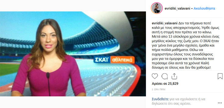 Το τέλος της συνεργασίας της με τον τηλεοπτικό σταθμό ΣΚΑΪ ανακοίνωσε μέσω του λογαριασμού της στο Instagram η Ευρυδίκη Βαλαβάνη, η οποία αποχωρεί μετά από 13 χρόνια στο κανάλι.