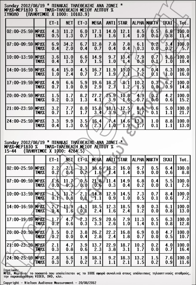 Στην πρώτη θέση της προτίμησης των τηλεθεατών ήρθε το δελτίο του Mega με 26,2%. Στη δεύτερη θέση ο ΑΝΤ1 με 22,2% και στην τρίτη το STAR με 18,7%.