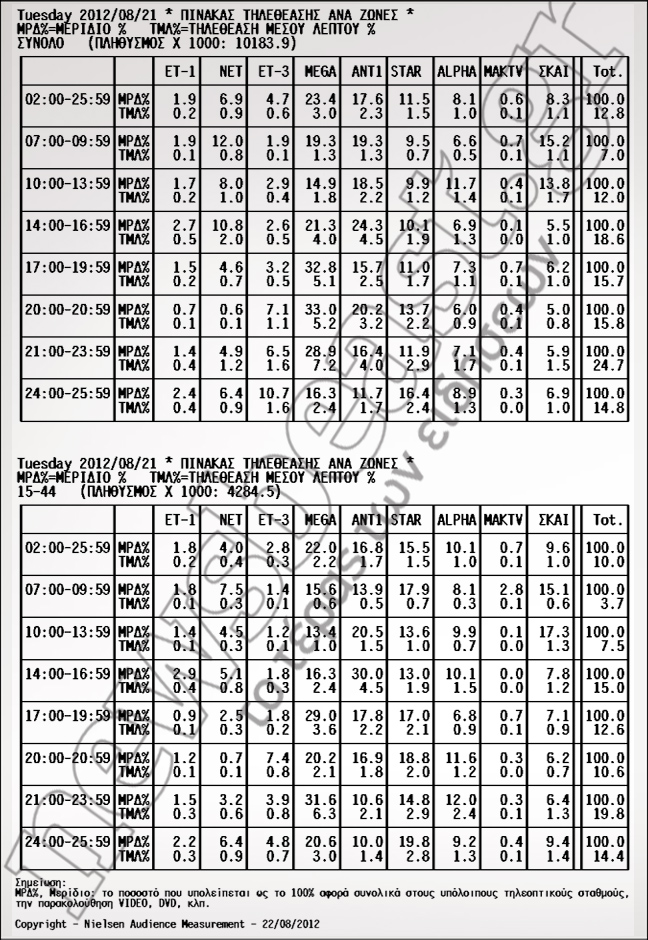 Με 33% τερμάτισε πρώτο το δελτίο ειδήσεων του Mega. Ακολούθησαν ΑΝΤ1 με 20,2% και STAR με 13,7%.