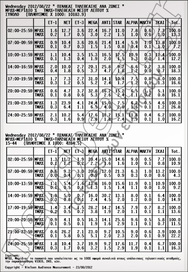 Πρώτο στην προτίμηση των τηλεθεατών του δελτίο του Star, που συγκέντρωσε ποσοστό τηλεθέασης 25,6%. Στη δεύτερη θέση το Μega με 16,3% και στην τρίτη ο ΑΝΤ1 με 14,1%.
