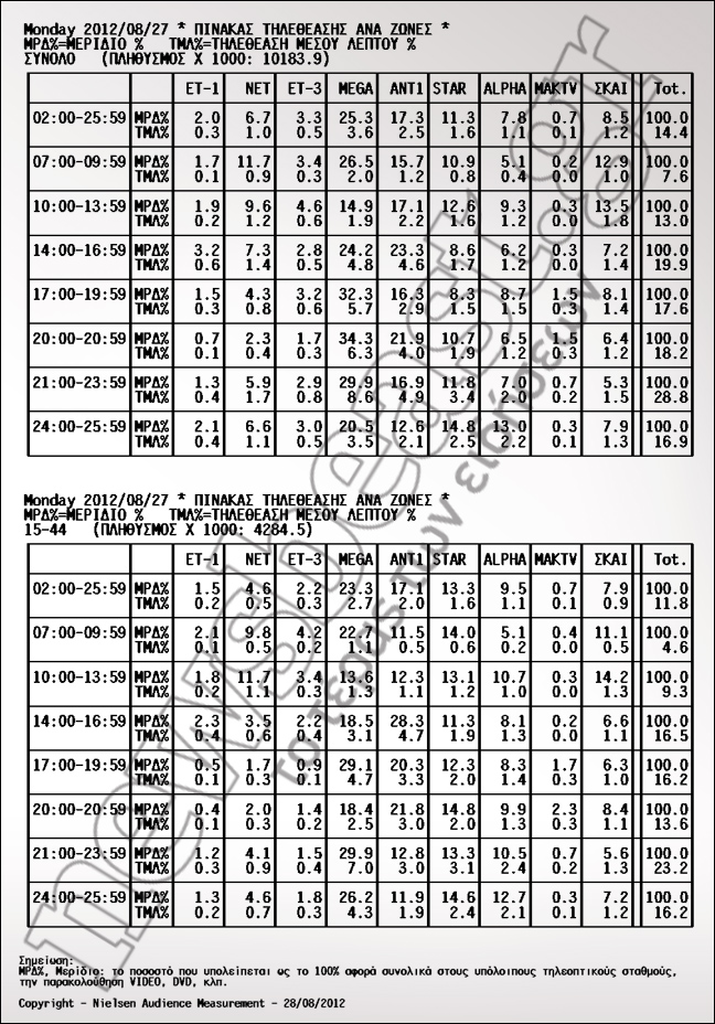 Στην πρώτη θέση της προτίμησης των τηλεθεατών το δελτίο του ΑΝΤ1 με 21,8%. Ακολούθησαν Mega με 18,4% και STAR με 14,8%.