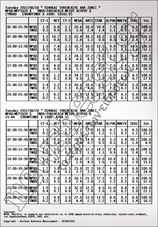 Στην πρώτη θέση στη «μάχη» της τηλεθέασης το δελτίο του Mega με 32,2%. Ακολούθησαν το δελτίο του ANT1 με 21,3% και το δελτίο του STAR με 11,2%.