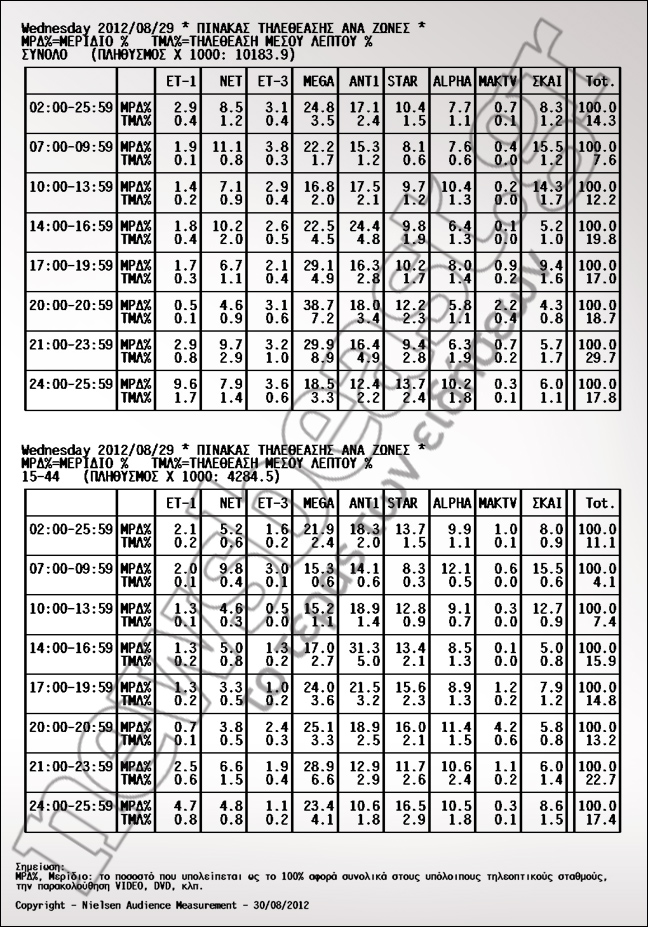 Με 38,7% κέρδισε την «κούρσα» της τηλεθέασης το δελτίο του Mega. Ακολούθησαν το δελτίο του ΑΝΤ1 με 18% και το δελτίο του STAR με 12,2%.
