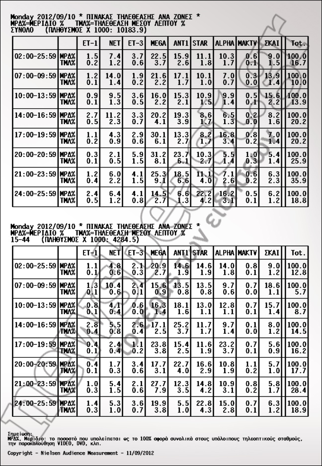 Νικητής στην «μάχη» της τηλεθέασης το δελτίο του ΑΝΤ1 με 22,7%. Ακολούθησαν το δελτίο του Mega με 17,7% και το δελτίο του STAR με 16,6%.