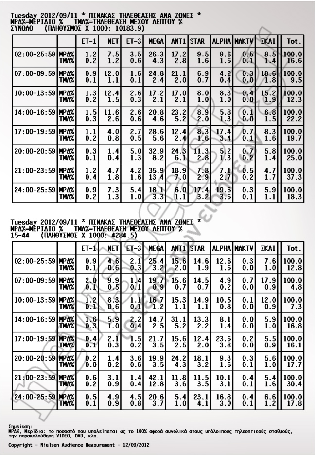 Στην πρώτη θέση προτίμησης των τηλεθεατών το δελτίο του ΑΝΤ1 με 24,2%. Στη δεύτερη θέση το δελτίο του Mega με 19,9% και στην τρίτη το δελτίο του STAR με 18,1%.
