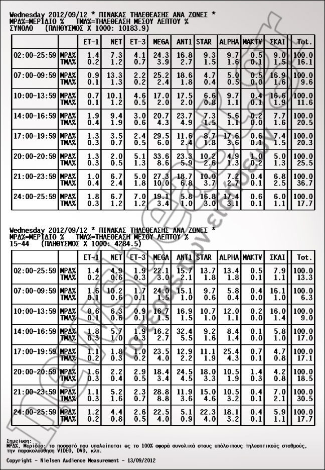 Πρωτιά Mega με 33,6%. Ακολούθησαν ΑΝΤ1 με 23,3% και STAR με 10,2%.