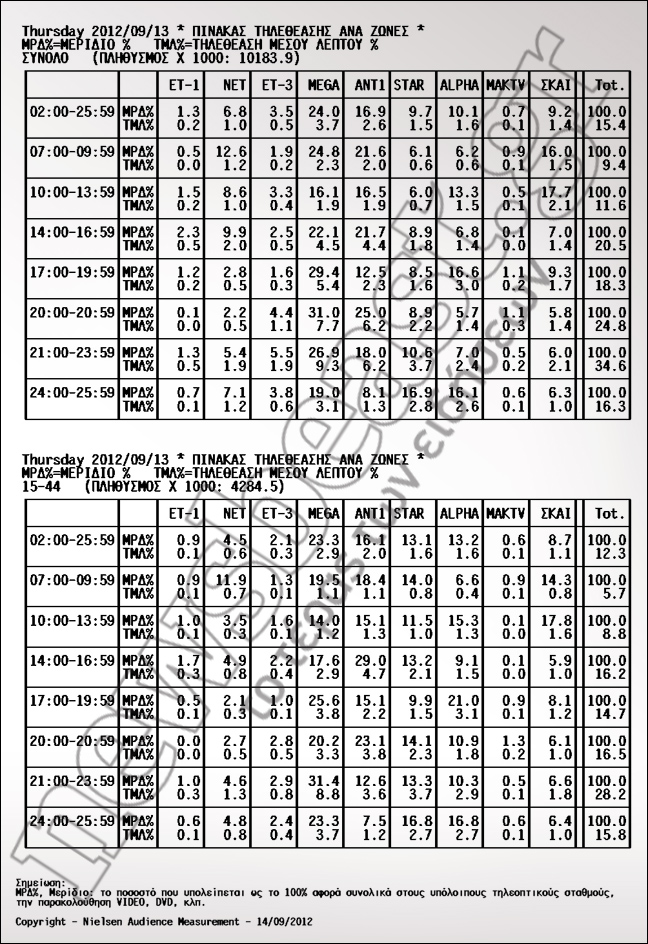 Στην κορυφή της προτίμησης των τηλεθεατών το δελτίο του ΑΝΤ1 με 23,1%. Ακολούθησαν Mega με 20,2% και STAR με 14,1%.