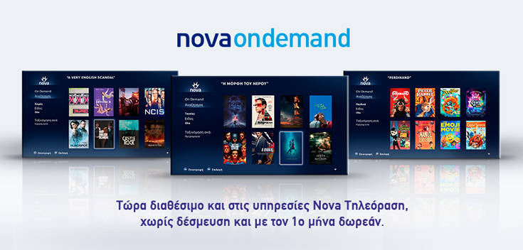 Η Nova, κορυφαίος πάροχος συνδυαστικών υπηρεσιών ψυχαγωγίας και επικοινωνίας στην Ελλάδα, συνεχίζει να καινοτομεί και να αναβαθμίζει την εμπειρία των συνδρομητών της. Με την υπηρεσία Nova Οn Demand η Nova έχει αλλάξει τον τρόπο με τον οποίο οι συνδρομητές βλέπουν το αγαπημένο τους θέαμα στην τηλεόραση. Μέχρι σήμερα, οι συνδρομητές Nova3play απολαμβάνουν με το πάτημα ενός κουμπιού μια μεγάλη ποικιλία από, πρεμιέρες, επεισόδια από βραβευμένες σειρές αλλά και ολόκληρους κύκλους σειρών (Nova Box Set), παιδικά, ντοκιμαντέρ, αφιερώματα, ψυχαγωγικά shows καθώς και αθλητικά. Πλέον αυτός ο πλούτος θεάματος του Nova On Demand είναι διαθέσιμος και σε όλους τους συνδρομητές Nova Τηλεόραση προκειμένου να απολαμβάνουν πάντα αυτό που θέλουν, όποτε θέλουν, με τον 1ο μήνα δωρεάν και στη συνέχεια με μία μικρή μηνιαία χρέωση (5 ευρώ/μήνα), χωρίς δέσμευση.
