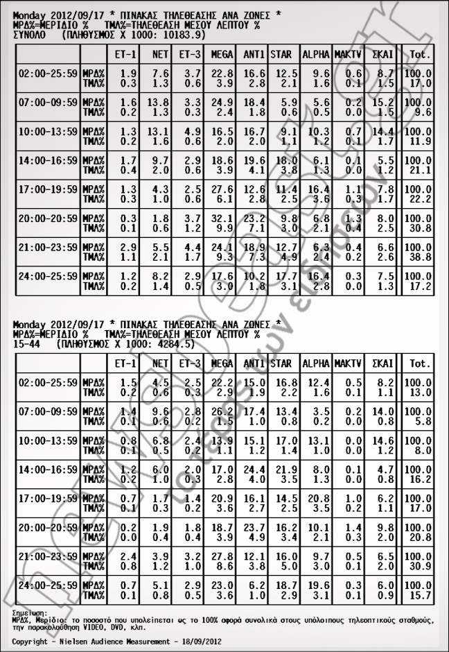 Πρωτιά για το δελτίο του ΑΝΤ1 με ποσοστό 23,7%. Ακολούθησαν το δελτίο του Mega με 18,7% και το δελτίο του STAR με 16,2%.