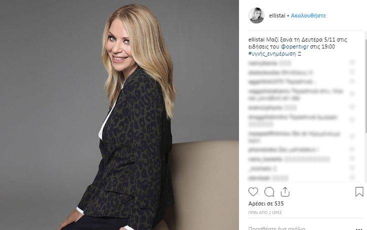 Απούσα θα είναι και σήμερα από το κεντρικό δελτίο ειδήσεων του Open η Έλλη Στάη, που δεν παρουσίασε το δελτίο ούτε τις δύο προηγούμενες ημέρες λόγω ασθενείας. Με ανάρτησή της σήμερα στο Instagram, η Έλλη Στάη ανακοίνωσε πως δεν θα επιστρέψει στην παρουσίαση του δελτίου ούτε σήμερα, ούτε αύριο, αλλά ούτε και την Παρασκευή, και θα είναι ξανά στους δέκτες μας από τη Δευτέρα 5 Νοεμβρίου. Κάνοντας μάλιστα ένα λογοπαίγνιο, χρησιμοποίησε το hashtag #υγιής _ενημέρωση.