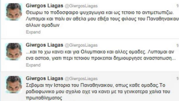 Ωστόσο μέσω του λογαριασμού του στο Twitter ο Γιώργος Λιάγκας ζήτησε συγγνώμη για το αστείο του. «Σέβομαι την ιστορία του Παναθηναϊκού όπως κάθε ομάδας. Το ραδιοφωνικό μου σχόλιο είχε να κάνει με τα γενικότερα χάλια του πρωταθλήματος και το έχω κάνει και για Ολυμπιακό και για άλλες ομάδες. Λυπάμαι αν ένα αστείο, γιατί περί τέτοιου πρόκειται προκάλεσε αναστάτωση… Θεωρώ το ποδόσφαιρο ψυχαγωγία και ως τέτοιο το αντιμετωπίζω. Λυπάμαι και πάλι αν άθελα μου έθιξα τους φίλους του Παναθηναϊκού η άλλων ομάδων», έγραψε.