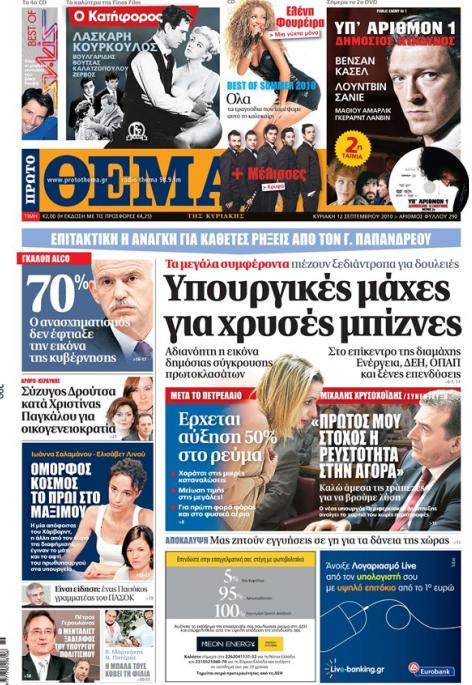 Μην χάσετε αύριο το «Πρώτο θέμα» το οποίο περιλαμβάνει το 2ο dvd της ταινίας «Υπ’ αριθμόν 1 δημόσιος κίνδυνος» με τους Κασέλ και Σανιέ, dvd με την κλασική ελληνική ταινία «Ο κατήφορος» με την Λάσκαρη και τον Κούρκουλο, το 4ο cd με τις μεγαλύτερες επιτυχίες του Σάκη Ρουβά και το cd «Best of summer 2010» με τις Μέλισσες και την Ελένη Φουρέιρα.