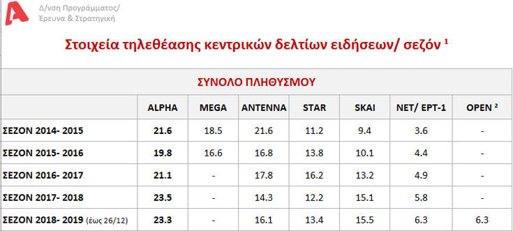 Από την 1η έως και τις 26 Δεκεμβρίου 2018, το κεντρικό δελτίο ειδήσεων του Alpha ήταν στην 1η θέση στο σύνολο κοινού, σημειώνοντας μέσο όρο 22,4% (781.000 τηλεθεατές), μπροστά από τα δελτία ειδήσεων του ανταγωνισμού κατά 5,5 μονάδες και πάνω.