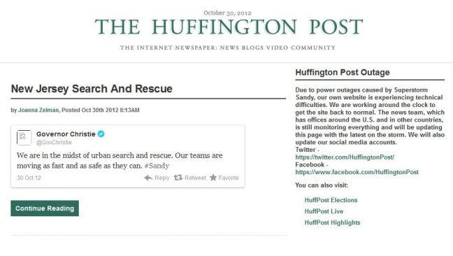 Ο τυφώνας «Σάντι» έριξε το site της Huffington Post μία από τις ιστοσελίδες με τη μεγαλύτερη επισκεψιμότητα στον κόσμο.