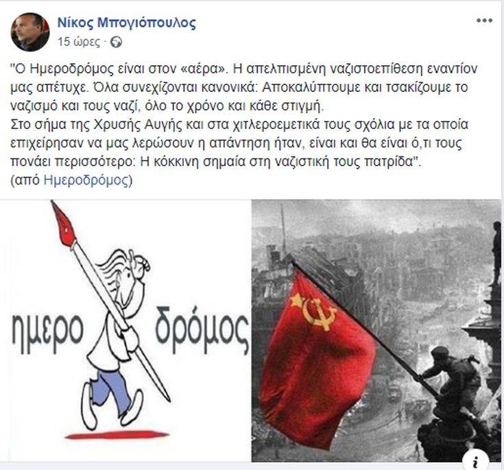 Στο όλο θέμα τοποθετήθηκε και ο Νίκος Μπογιόπουλος με ανάρτησή του στο Facebook. «Ο Ημεροδρόμος είναι στον «αέρα». Η απελπισμένη ναζιστοεπίθεση εναντίον μας απέτυχε. Όλα συνεχίζονται κανονικά: Αποκαλύπτουμε και τσακίζουμε το ναζισμό και τους ναζί, όλο το χρόνο και κάθε στιγμή.