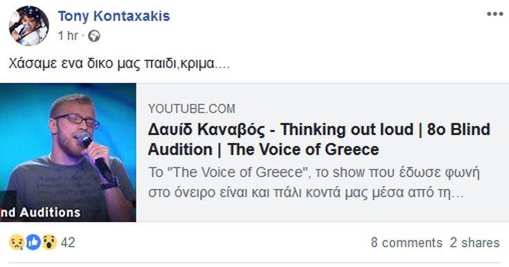 Σοκαρισμένοι οι συντελεστές του γνωστού διαγωνισμού τραγουδιού, The Voice of Greece στην είδηση ότι ένας παίκτης έφυγε από τη ζωή, όπως ανακοίνωσε ο μαέστρος του παιχνιδιού.