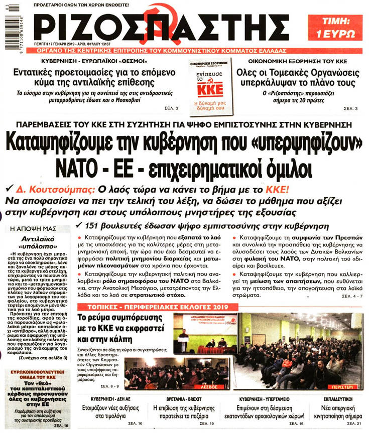 ΡΙΖΟΣΠΑΣΤΗΣ: «Καταδικάζουμε την κυβέρνηση που “υπερψηφίζουν” ΝΑΤΟ-ΕΕ-επιχειρηματικοί όμιλοι»