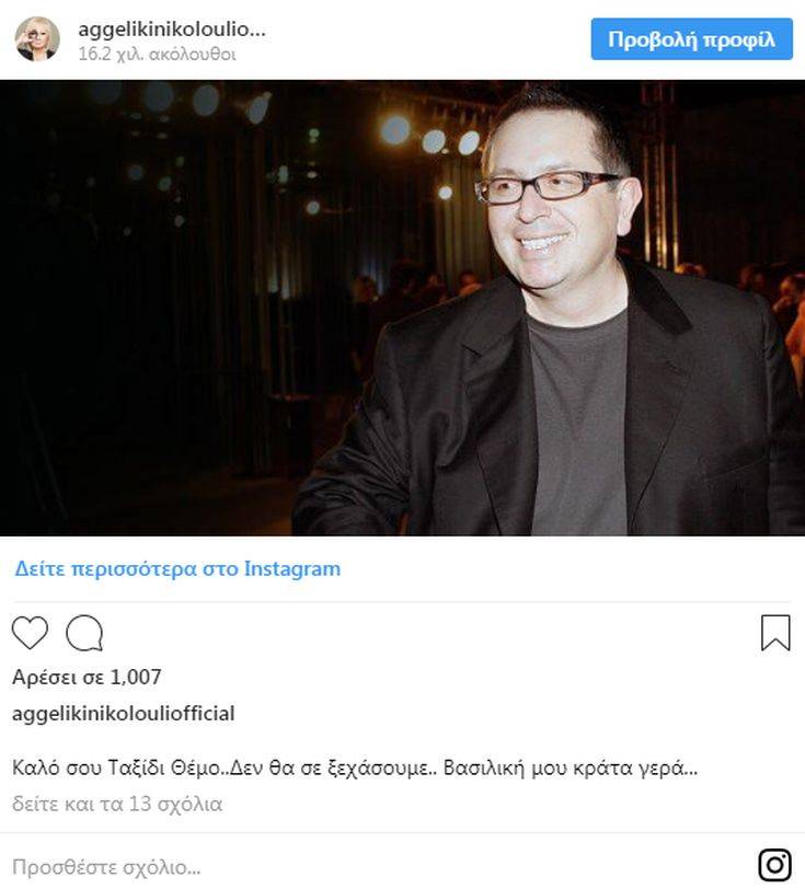 «Καλό σου Ταξίδι Θέμο… Δεν θα σε ξεχάσουμε… Βασιλική μου κράτα γερά…», ήταν το λιτό μήνυμα της Αγγελικής Νικολούλη.