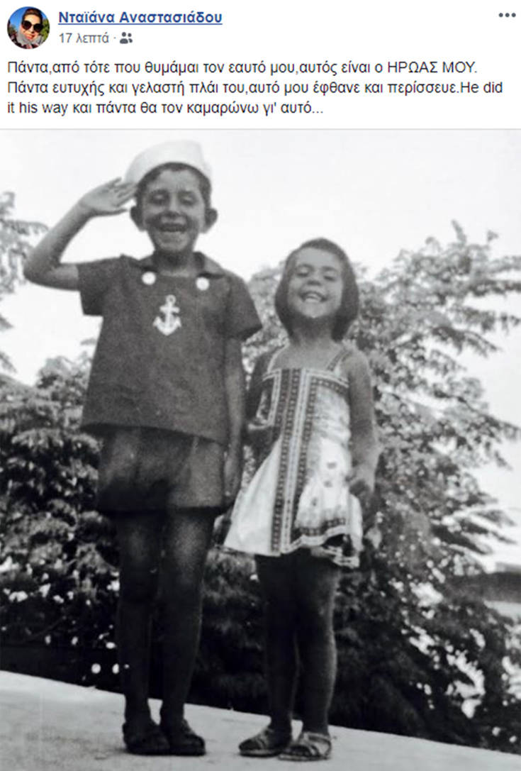 «Πάντα, από τότε που θυμάμαι τον εαυτό μου, αυτός είναι ο ΗΡΩΑΣ ΜΟΥ. Πάντα ευτυχής και γελαστή πλάι του, αυτό μου έφθανε και περίσσευε. He did it his way και πάντα θα τον καμαρώνω γι’ αυτό…», έγραψε στον λογαριασμό της στο Facebook.