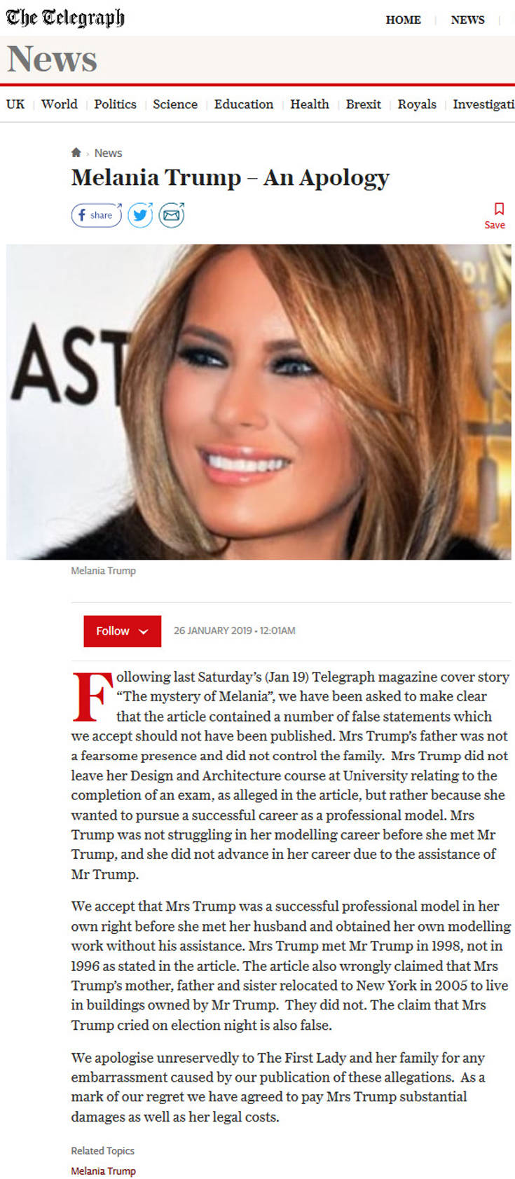 Κείμενο με το οποίο ζητά συγγνώμη από την Πρώτη Κυρία των ΗΠΑ Μελάνια Τραμπ, για άρθρο της περασμένης εβδομάδας, δημοσίευσε η βρετανική εφημερίδα «Daily Telegraph».