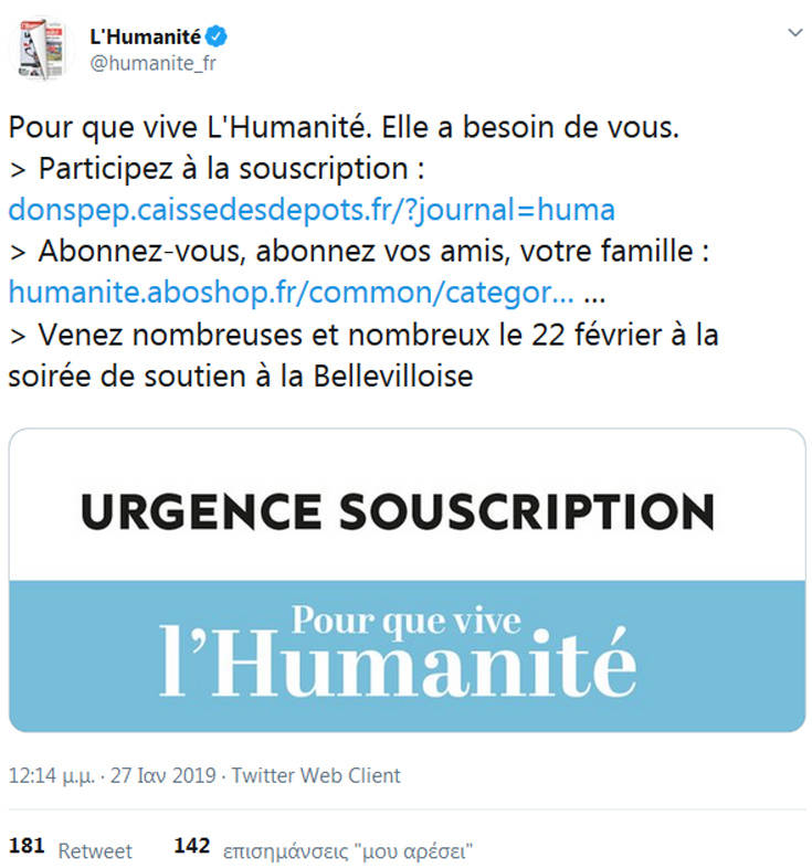 «Τη στιγμή που τόσες συζητήσεις γίνονται και τόσες ανησυχίες εκφράζονται για τις ‘φάμπρικες’ των ‘ψευδών ειδήσεων’, το να αφεθεί η Humanité να πεθάνει θα ισοδυναμούσε με εξασθένηση του ποιοτικού Τύπου» στη Γαλλία, τόνισε ο διευθυντής της εφημερίδας Πατρίκ Λε Ιαρίκ σε έκκλησή του που δημοσιεύεται σήμερα από την εφημερίδα.