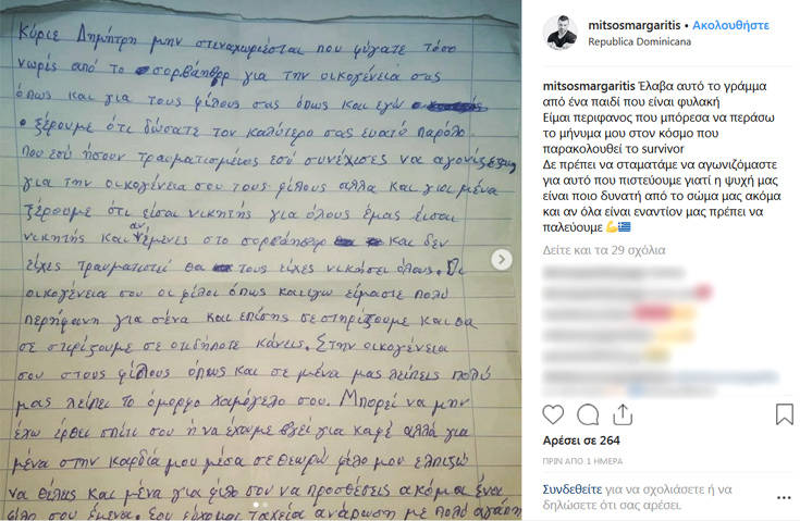 Η αλήθεια είναι ότι ο 45χρονος δεσμοφύλακας στις φυλακές Κορυδαλλού, δεν πρόλαβε καν να δείξει τις δυνατότητές του μέσα στο Survivor 3, αφού τραυματίστηκε σχεδόν από την αρχή του. Ωστόσο, φαίνεται ότι κατάφερε να εμπνεύσει κάποιους. Ο Μαργαρίτης ανέβασε στον προσωπικό του λογαριασμό στο Instagram το γράμμα που του έστειλε ένα παιδί από τη φυλακή και που τον συγκίνησε ιδιαίτερα.