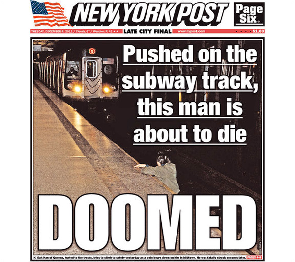 Σοκάρει το πρωτοσέλιδο της New York Post, το οποίο δείχνει έναν άνδρα να κρέμεται από την αποβάθρα λίγο πριν τον χτυπήσει αμαξοστοιχία στο μετρό της Νέας Υόρκης.