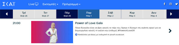 Ωστόσο, η μετακίνηση του Σπύρου Παπαδόπουλου σημαίνει ότι μένει κενή η ώρα του την Παρασκευή. Και αυτό το κενό έρχεται να καλύψει το Gala του Power Of Love, που στην ουσία επιστρέφει στη συγκεκριμένη ημέρα και ώρα, αφού και αυτό είχε μετακινηθεί στο απόγευμα της Κυριακής ελεώ Survivor. Έτσι, αυτή την Παρασκευή (1/3) όπως βλέπουμε και στο πρόγραμμα το καναλιού, θα έχουμε το Gala του ριάλιτι αγάπης.