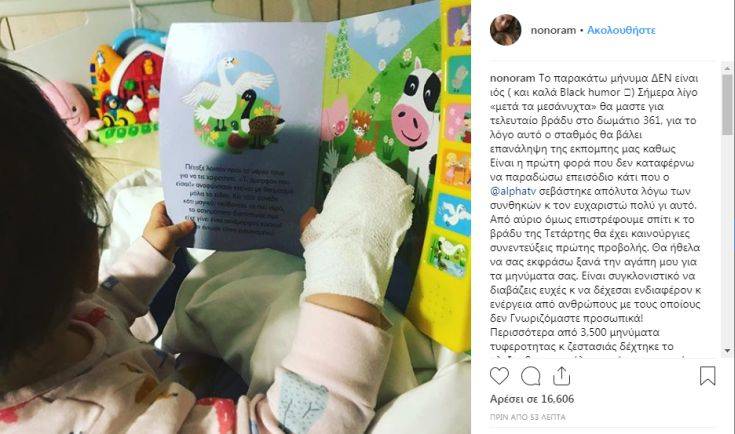 «Το παρακάτω μήνυμα ΔΕΝ είναι ιός ( και καλά Black humor) Σήμερα λίγο «μετά τα μεσάνυχτα» θα ‘μαστε για τελευταίο βράδυ στο δωμάτιο 361, για το λόγο αυτό ο σταθμός θα βάλει επανάληψη της εκπομπής μας καθώς είναι η πρώτη φορά που δεν καταφέρνω να παραδώσω επεισόδιο κάτι που ο @alphatv σεβάστηκε απόλυτα λόγω των συνθηκών κ τον ευχαριστώ πολύ γι αυτό. Από αύριο όμως επιστρέφουμε σπίτι κ το βράδυ της Τετάρτης θα έχει καινούργιες συνεντεύξεις πρώτης προβολής. Θα ήθελα να σας εκφράσω ξανά την αγάπη μου για τα μηνύματα σας. Είναι συγκλονιστικό να διαβάζεις ευχές κ να δέχεσαι ενδιαφέρον κ ενέργεια από ανθρώπους με τους οποίους δεν Γνωριζόμαστε προσωπικά!