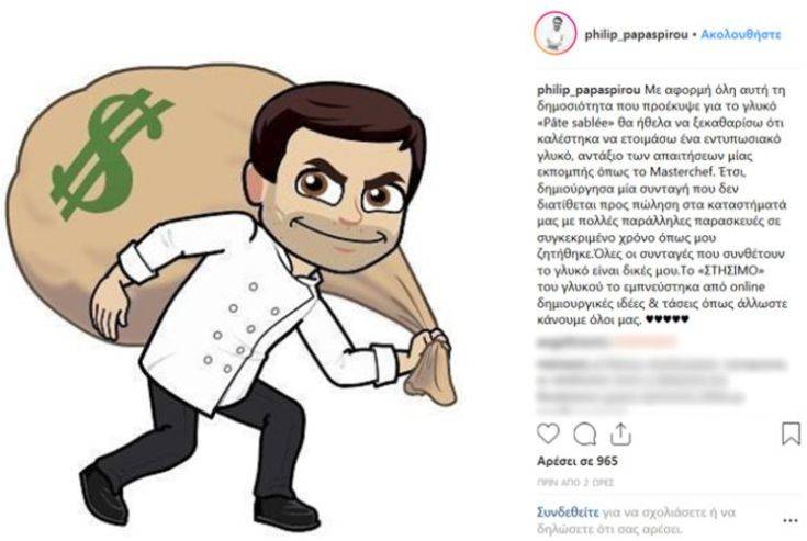 «Με αφορμή όλη αυτή τη δημοσιότητα που προέκυψε για το γλυκό «Pâte sablée» θα ήθελα να ξεκαθαρίσω ότι καλέστηκα να ετοιμάσω ένα εντυπωσιακό γλυκό, αντάξιο των απαιτήσεων μίας εκπομπής όπως το Masterchef. Έτσι, δημιούργησα μία συνταγή που δεν διατίθεται προς πώληση στα καταστήματά μας με πολλές παράλληλες παρασκευές σε συγκεκριμένο χρόνο όπως μου ζητήθηκε. Όλες οι συνταγές που συνθέτουν το γλυκό είναι δικές μου. Το «ΣΤΗΣΙΜΟ» του γλυκού το εμπνεύστηκα από online δημιουργικές ιδέες & τάσεις όπως άλλωστε κάνουμε όλοι μας.» έγραψε ο Φίλιππος Παπασπύρου και συνόδευσε το κείμενο του με μια φωτογραφία ενός… ληστή!
