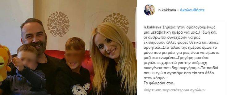 «Σήμερα ήταν ομολογουμένως μια μεταβατική ημέρα για μας… Η ζωή και οι άνθρωποι συνεχίζουν να μας εκπλήσσουν άλλες φορές θετικά και άλλες αρνητικά… Στο τέλος της ημέρας όμως το μόνο που μετράει για μας είναι να είμαστε μαζί και ενωμένοι… Γρηγόρη μου ένα μεγάλο ευχαριστώ για την υπέροχη οικογένεια που δημιουργήσαμε… Τα παιδιά σου κι εγώ σ αγαπάμε όσο τίποτα άλλο στον κόσμο… Το φιλαράκι σου…», έγραψε η Νάταλι Κάκκαβα.